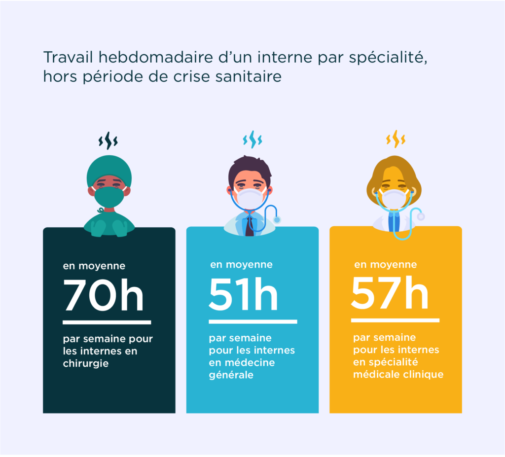 • Les internes des spécialités médicales cliniques (par ex : cardiologie, neurologie, gériatrie, etc.) voient leur semaine de travail chargée de 57,1 heures en moyenne.