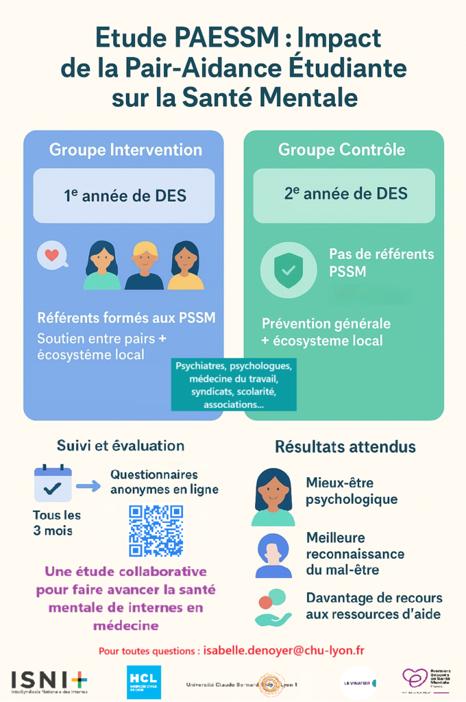 Pour participer : envoie par mail à isabelle.denoyer@chu-lyon.fr tes nom, prénom, mail personnel, ta spécialité et ton année d’internat (première ou deuxième), afin que nous puissions te faire parvenir le premier questionnaire !