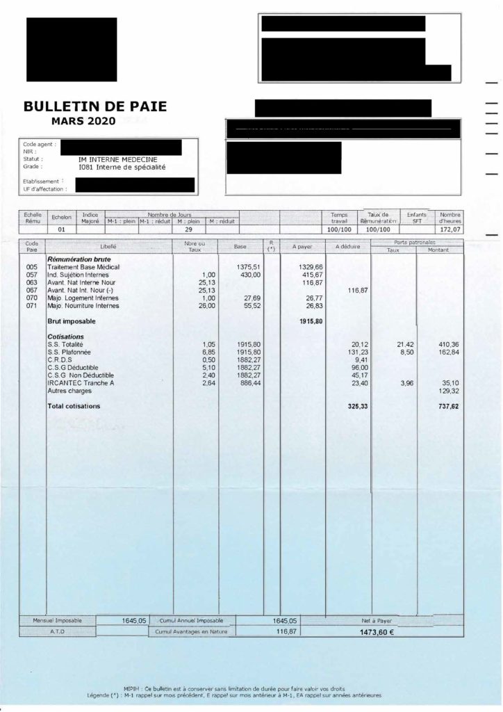 Rappelons que les internes travaillent en temps normal 58h hebdomadaires, bien au delà du maximum légal, pour un salaire mensuel net de 1400 euros pour un minimum de 6 ans d’études de médecine derrière eux.